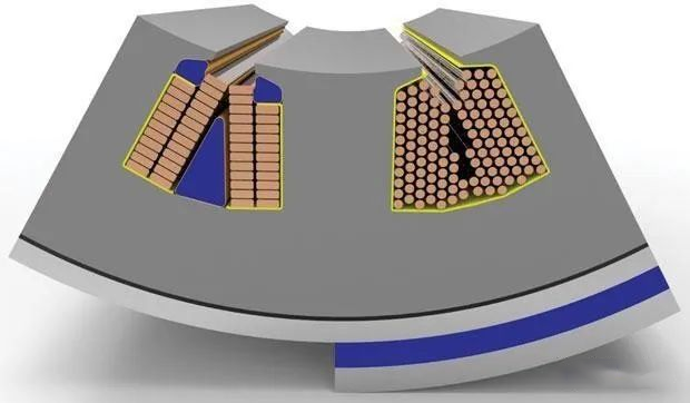 扁線電機和傳統(tǒng)圓線電機并沒有太大的結(jié)構(gòu)區(qū)別,也基本包括定子鐵芯、定子繞組、轉(zhuǎn)子鐵芯、轉(zhuǎn)子繞組、機座、端蓋和軸承等。扁線電機和圓線電機******的區(qū)別就是扁線電機改變了銅線形狀,將原本圓形的銅線變?yōu)榱吮庑毋~線。銅線形狀的改變意味著在定子鐵芯的槽內(nèi)空間大小不變的情況下,空間利用率得到了巨大提升,即槽滿率的提升。